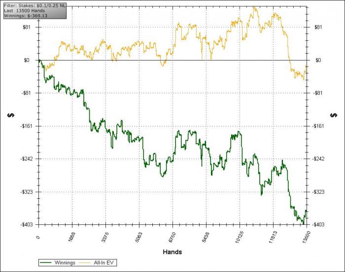 Если прикинуть рейнджи вэльюбетов и полублефов в данной раздаче, то становится практически очевидно, что большинство игроков после чека ривера будут играть или чек/фолд, или чек/пуш (при этом с сильным смещением в сторону первого варианта). Поэтому оппонент получает слишком дешевую возможность блефа, имея под 80% ФЕ при ставке на эниту. Понимая это, в некоторых ситуациях достаточно выгодно превратить руку моего типа не в блеф третьим баррелем (все-таки вэльюбет тут слишком тонок и явно не против шоудаун-нита вроде nutedawg'a), а в блеф-катчер, потому что многие игроки попытаются превратить тут даже средний трипс тузов в блеф, пытаясь выбить более сильный наш.