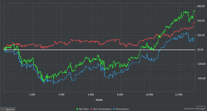 Что любопытно, начал я опять с залива и только спустя 3000 рук график попер вверх. Играю как , но по пока получается не смотря на классический залив вначале около 10бб/100. Играю в три стола. График с начала недели (два игровых дня).