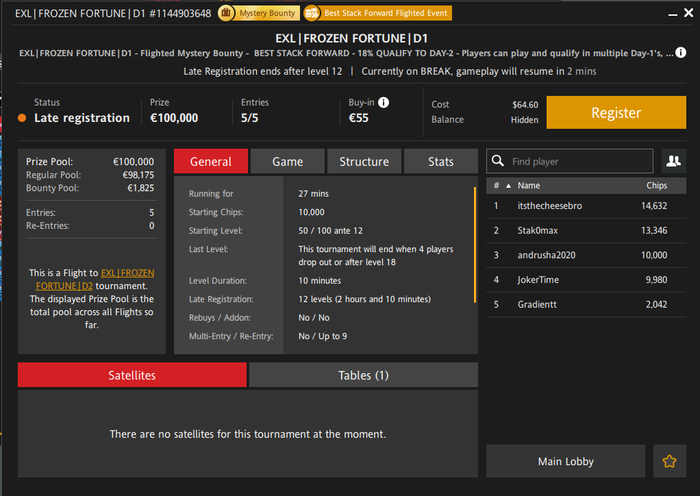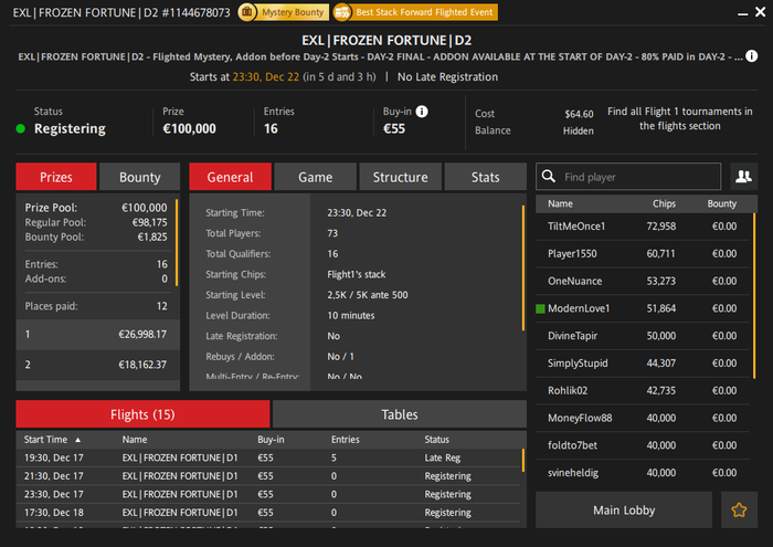 У меня в лобби вообще этого турнира нет, только саты к нему. После отката версии пропали как значки "Mystery Bounty" так и сами турниры. У тебя какая версия клиента?