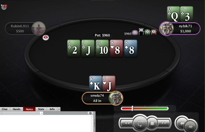 Финальная раздача, до этого оп раза 4 убивал мои Ах своими Qx, Kx.