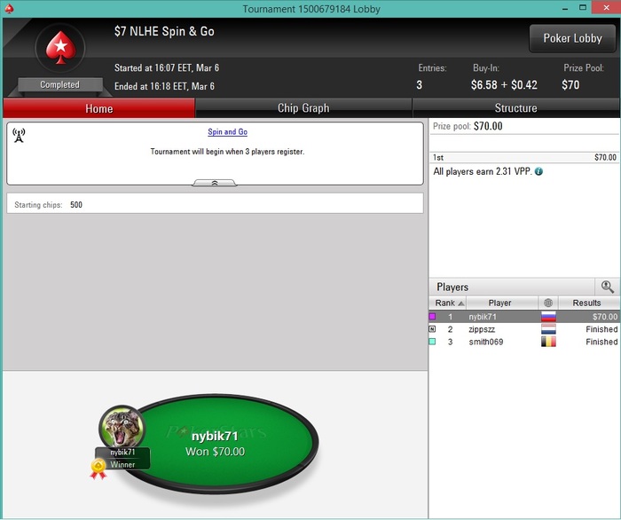 Poker Stars $6.58+$0.42 No Limit Hold'em Tournament - t30/t60 Blinds - 2 players -