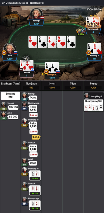 3) Ну и в 3 раздаче тоже залетаем всегда (в моем мире). Тут вообще пофигу на оппов, у нас слишком большой стек остается если всем програли. Условные 6 10с я бы залетал с К9 тем более
