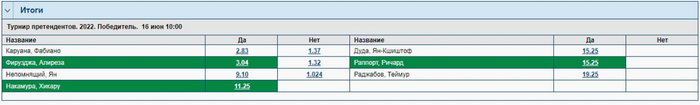 Хикару зарабатывает на стриминге слишком много, чтобы всерьез заниматься дебютом для этого турнира. Раппорт и Раджабов не претенденты на победу просто по уровню мастерства. Каруана и Фируджа претенденты, но на них низковат кэф. Дуда, мне кажется, имеет стиль игры, который всем известен и к которому не так трудно приспособиться на таком высоком уровне: он забирает всё, что ему жертвуют. Не удивлюсь, если станет вторым или третьим, но не вижу его победителем.