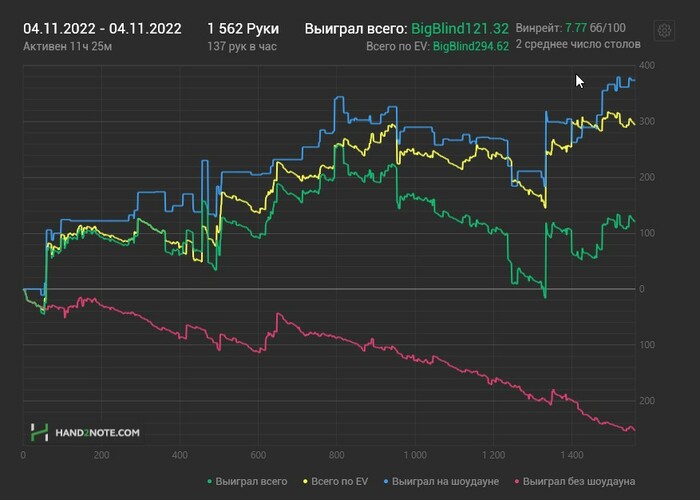 Сегодня первая игровая сессия ноября. Чувствую себя еще не очень, по этому сильно не грузился. 10 турниров на микро. Откатал ровно в 0. Но доволен - ошибок не было. Ну может быть где-то не добираю, но сложных решений как то и не хотелось. Посмотрим как откатаю завтра