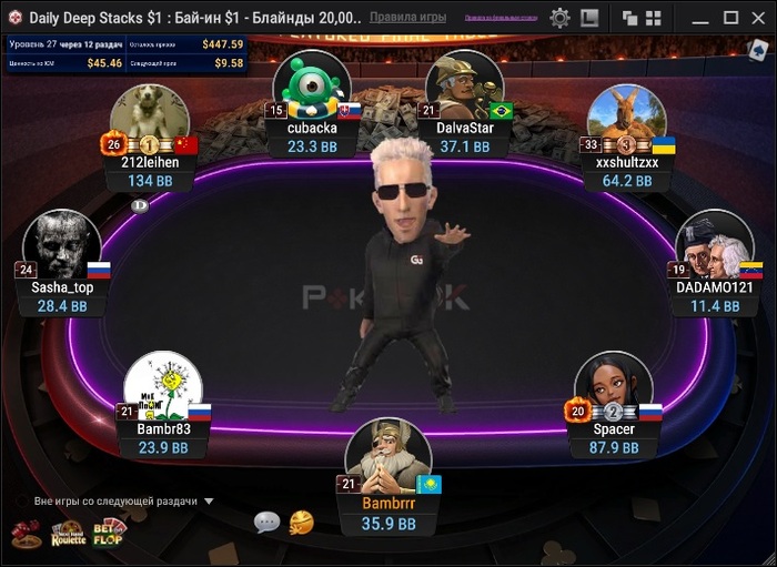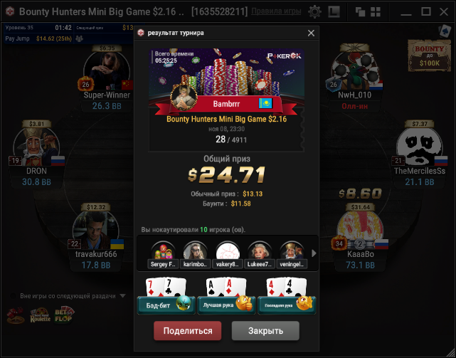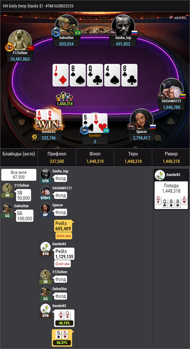 Этот турнир запомнился ситуацией, когда меня уронили до семи бб, но в последующие несколько раздач раскрутился до 47 бб. Камбекнулся так сказать))