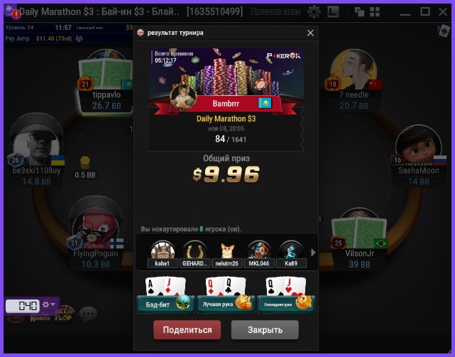 на финальный стол зашел с нормальным стеком, но дальше раздавать перестали. Стек в итоге растаял. Слева сидел какой-то родственник, судя по никнейму, вот в него остатки фишек и вгрузил