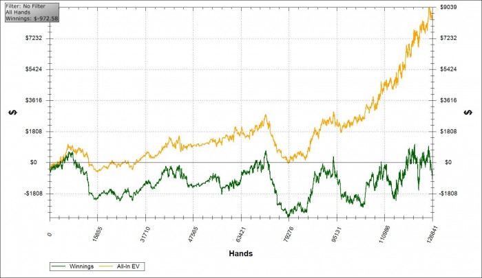 Сначала так. Хотел флоатнуть с тузом бубновым. Он много ставил флоп, но далее оч резко снижал агрессию и нормально фолдил. Не будь у меня туза, то даже не знаю осилил ли колл на ривере.