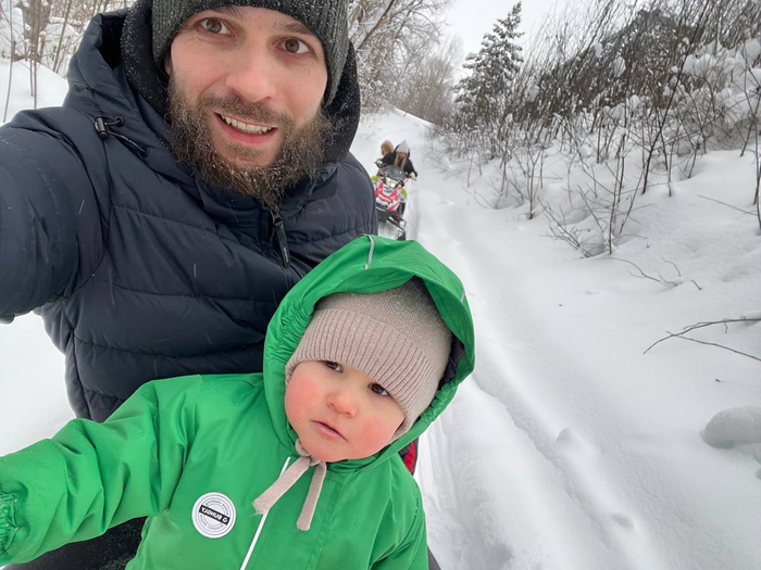Егор замёрз через полчаса и ему не очень было удобно держаться, бедняга в конце уже плакал, скорее всего из-за замерзших ног, или может ещё почему-то, но ему явно хватило. Поехали на базу, а так бы ещё катались и катались.