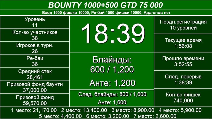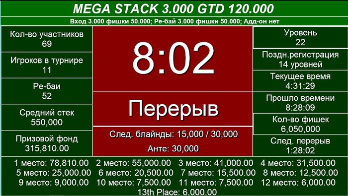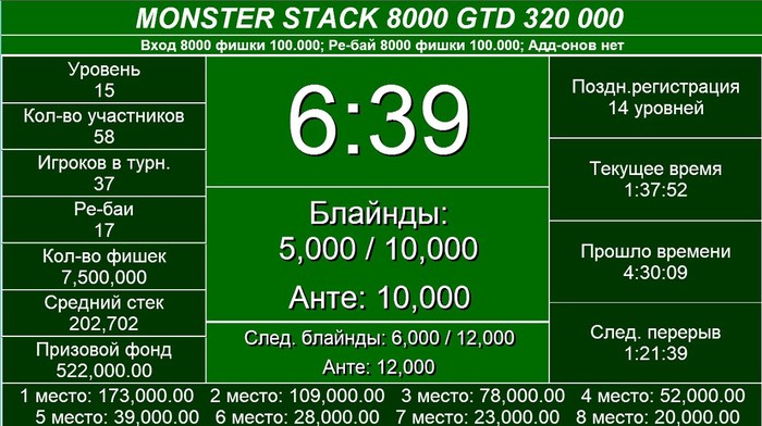 Итоги турнира: 7 место 4100 - Емельянов Сергей 6 место 5100 - Гордийко Сергей 5 место 6900 - Коновалов Юрий 4 место 9300 - Цветков Сергей 3 место 13900 - Мирошниченко Николай Вдвоем поделили по 26900 Михалищев Михаил и Дзюба Александр.