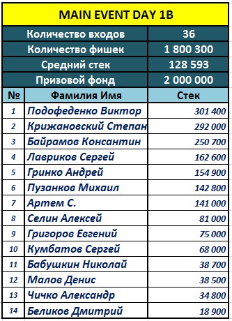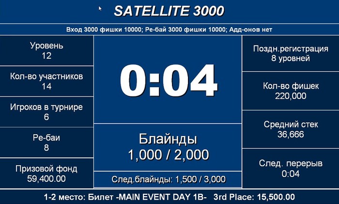 Сателлит на турнир TH NL+1R 1500 GTD 70 000 1. Бакаев Максим 2. Корнилов Денис 3. Ревунов Василий 4. Дзукаев Тузари 5. Житняк Михаил 6. Курило Валерий 7. Коновалов Анатолий 8. Филиппенкова Татьяна 9. Аджиев Шамиль 10. Галушко Алексей