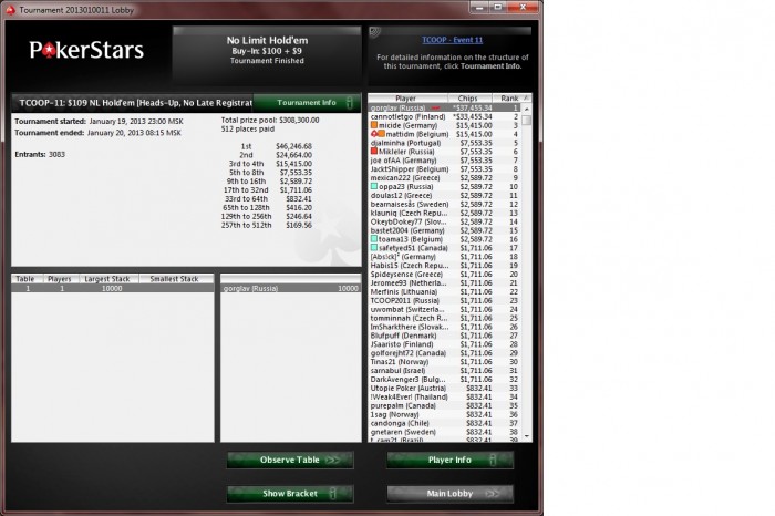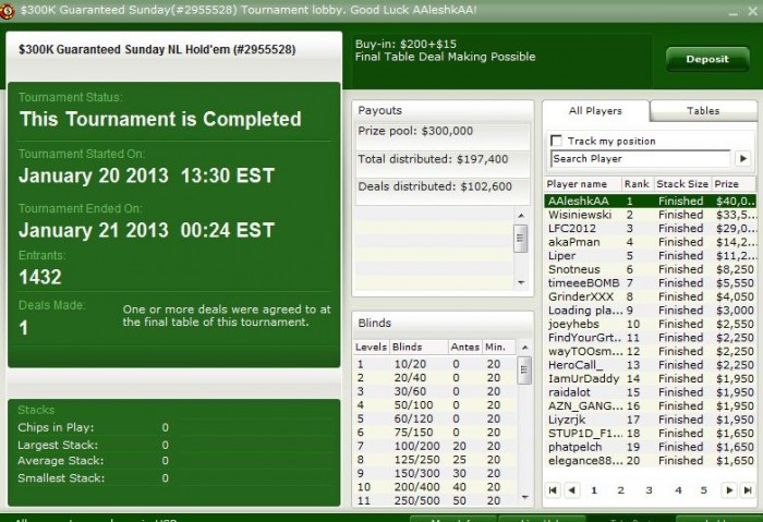 FaNjke @ 8.1.2013 Оппу нереально заходило на всей финалке и особенно в ХА, такого дикого лака не видел еще в своей жизни. Хэдз-ап вообще без шансов все, что наживал префлоп и без ШД он обв перекупал меня флопом, терном, ривером, хуивером, ваще хз как выиграть в таком ХА, когда оппу просто все складывается, закрывается каждый раннер гатшот и каждая совпадуха уже на префлопе трипс имеет, играл как говно пертое, пиздец вообще хз как я еще больше часа продержался с таким лаком надо в лотереи играть, телевикторины, поле чудес. Ну и обв конечно ВВ в А3с постфлоп в конце еще так ужасно сыграл хз почему он до сих пор не перешел в капитал шоу там с такой игрой шансов конечно побольше как он выигрывает вообще не могу понять столько лака вообще ни у кого не видел омг. Ну и префлоп олл-ин К9с в А3о в итоге, вообще без шансов, хз как так можно играть и еще каких-то марафонских бегах побеждать вообще не понимаю омг.