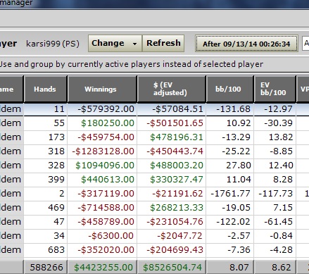 Вообще не сильно люблю ныть, но в последнее время просто нервы на пределе. Никак не могу выиграть на микро лимитах, хотя ЕВ за месяц всегда выше 8-9бб. Да и вообще с 13 сентября 2014 не могу выйти из стрика, стрик длинной в 11к игр у меня в первый раз. Теперь в цифрах с 09.14