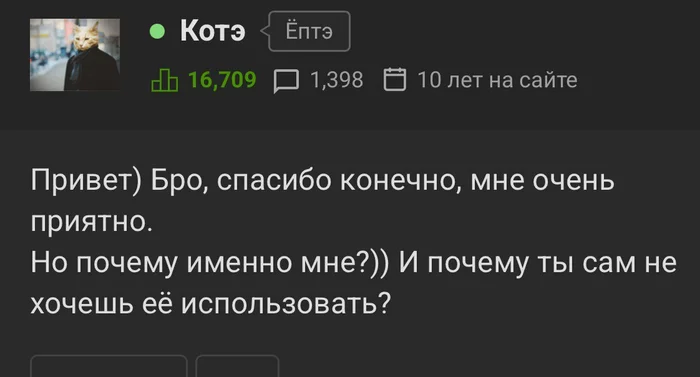 Давайте подумаем над логическими вариантами ответа, почему человек решил передать мне свою треню.
