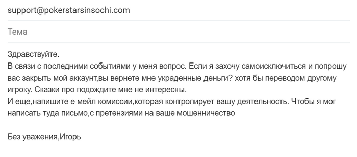 Я на ПС 10 лет играл, при этом я узнал от СМИ, что они сделали. К слову, письмо мне не пришло до сих пор. Публичная компания и т.д. я понимаю, даже могу понять если это исключительно их решение в вакууме, но разошлите письма, объясните ситуацию, назовите срок когда произойдет и дайте игрокам снять баланс, это же наши деньги, с которых вы рейк получили и т.д. Для меня очевидно отношение к нам и очень часто приходит в голову ассоциация с "цыганами". Для примера, тот же skrill на главном экране поместил рамку "снимайте деньги НЕМЕДЛЕННО до такого то времени".