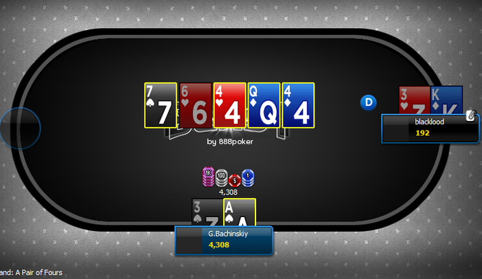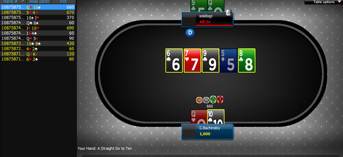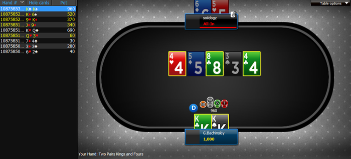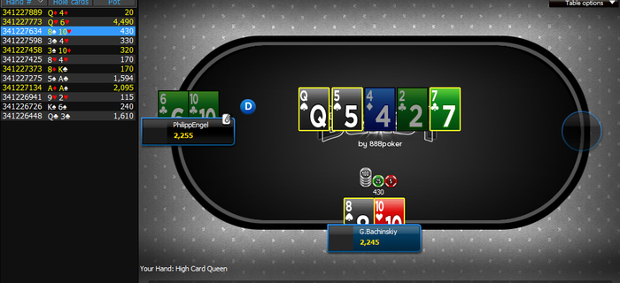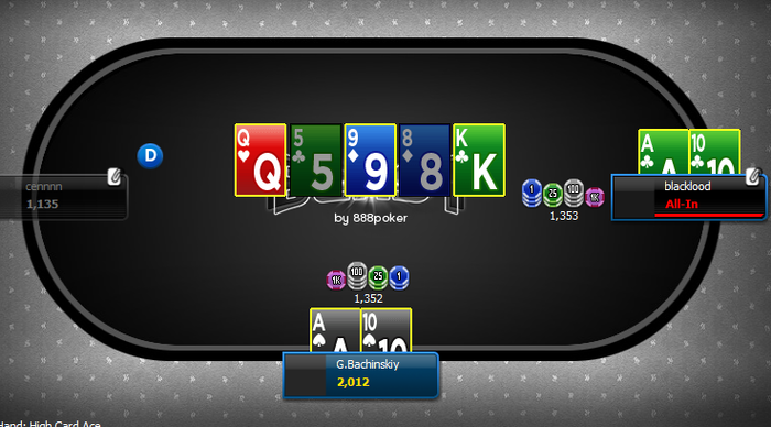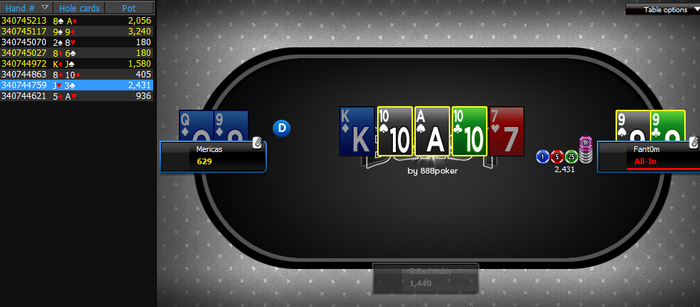 Было главное би все выиграл, а потом думаю, ладно развели в гипере за 5, три максе, долгой паузой, соперник думал, что не стоит рейзит QT, поймал допер, далее фул и добрал на ривере, другой радовался, потом я от радостного и вылетел запушив средний мусор в AQ...