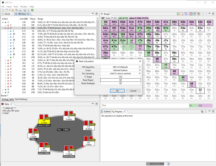 Пока считается: ну прям совсем не интуитивная программа, конечно! То есть круто, конечно, но кажется, что я просто обезьяна, тыкающая кнопки. Понятное дело, надо читать юзер гайд, там, кстати, bencb вещает: https://www.holdemresources.net/docs.