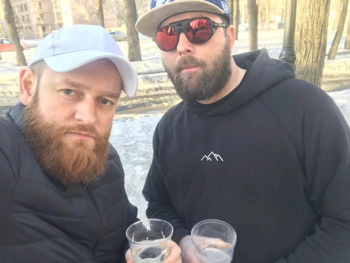 Встретились у Губахинского пива, взяли с собой и пешком пошли к стадиону. На улице наконец-то весна, +8, солнечно.