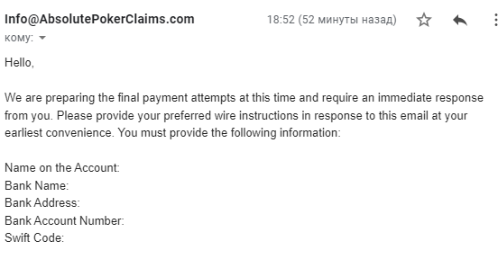 snaka, ответили с Info@AbsolutePokerClaims.com. После отправки им реквизитов, ответили, что апдейтили мою инфу