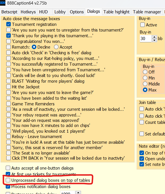 Привет. в 888 кепшн не активируется автоматически таймбанк за столами.Вроде галочки стоят. Также при корректировки колесиком мыши шаг - 1бб,хотя в настройки 0.25 ставил.Можно ли как нибудь сделать чтобы копировать ники игроков или сразу кликом,чтобы их пробить?Подскажите пожалуйста