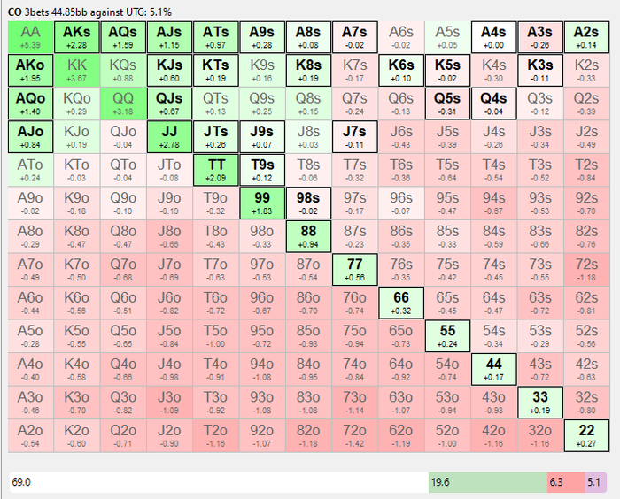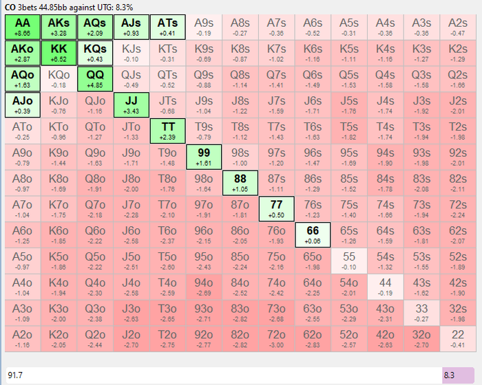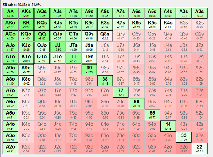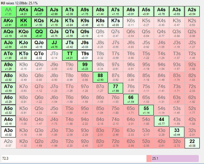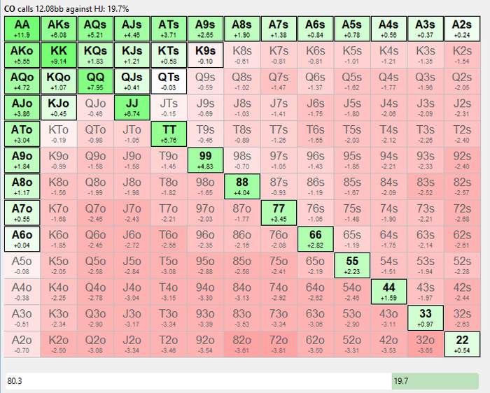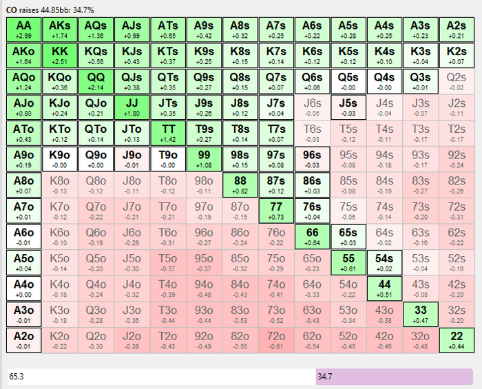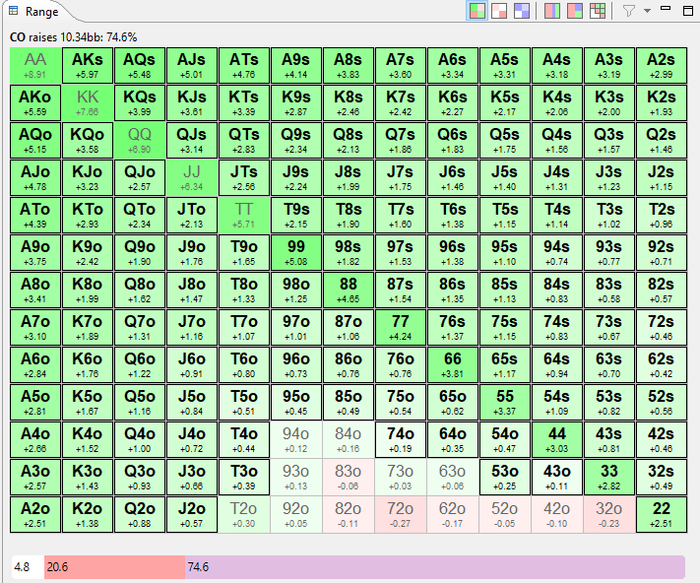 И вот удивление - как принимаем мы на СО, при том, что покрываем в два раза. Не уверен, что из-за того, что не использовал тут FGS нет искажения, впрочем. Интуитивно я б тут завел JTs, Q9s, K9s, да даже 98s+, KTo, QJo