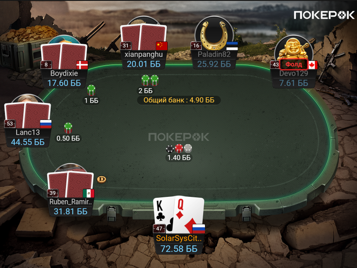 Про пас префлоп речь и не идёт. Если бы ты внимательнее посмотрел на мой расчет, 72s там вполне плюсовый опен. При этом нам нет особого смысла заходить лимпом, потому что мы не хотим, чтобы кто-то другой забрал нок ББ - мы хотим выбить их из банка. С 72s в целом успех, если все сфолдят!