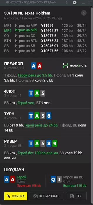 Кстати, вне столов мне сайзинг на ривере не нравится, но как под ругому сыграть не знаю. Чекбихать не имеем права точно ривер, ставить 25бб в 50бб и типа пас на пуш... видимо так.