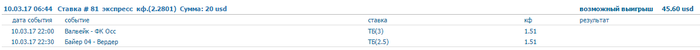 Поставил еще 20$ в офе, как и планировал. В итоге, у меня стоит 40$ на кеф 2,86.