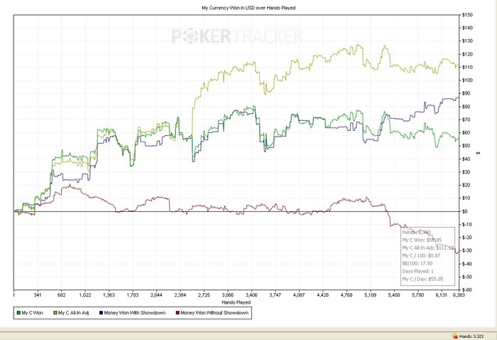 PokerStars - $0.05 Ante $0.01 NL (6 max) - Holdem - 6 playersHand converted by PokerTracker 4SB: $15.55 (VPIP: 78.36, PFR: 1.34, 3Bet Preflop: 0.58, Hands: 1,149)