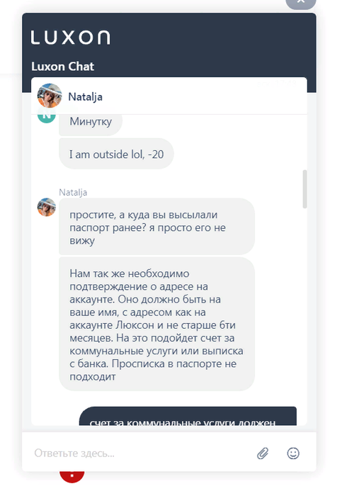 ))люксон вот как я проходил верификацию написал в чат что хочу ее пройти с начало мне ответила Nelly я задал вопрос? она мне минутку .Я жду, и она мне выдает"I am outside lol, -20" перевод на русский "Я на улице, лол, -20" и 5 минут молчания)) первая мысль че за хуй.ня? она меня что лохам назвала? и какова ху.я она на улице -20 у них офис что где то под мостом?