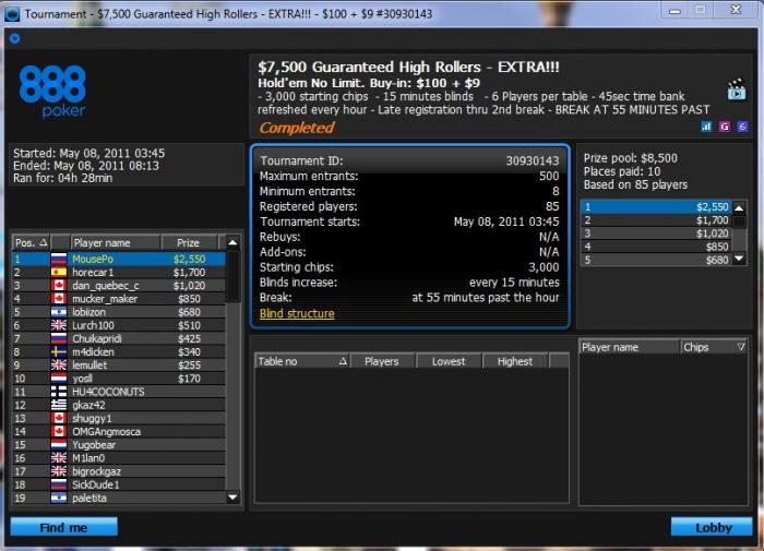 UPD: в одном уже финалка! (6 из 9) , а в другом я - чипак из 16-ти. Сумма первых мест в обоих туриках = $10000! а мне как раз эта сумма необходима, чтобы почувствовать себя удовлетворенным сегодня ;)