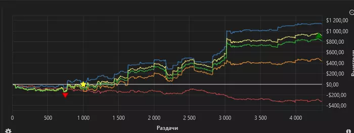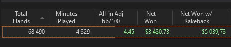 Начинал месяц с глубокого мэйка в 4к+ и каткой 50к рук в ноль. Как обычно, когда деньги прижали, удалось собраться с силами и показать кун-фу. Даже перебрал 1к. Отбил мэйк и даже что-то сплитанул. Вместе с РБ что-то около +5300 вышло. ХМ учел не все руки