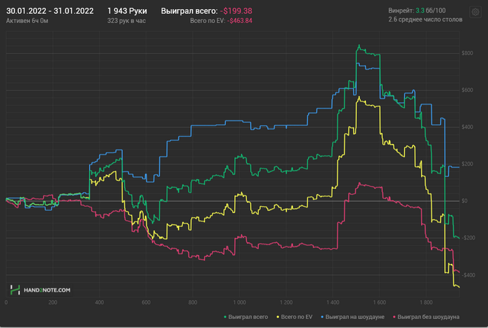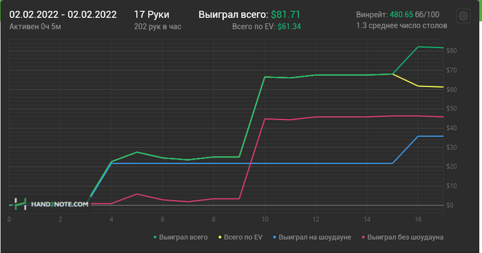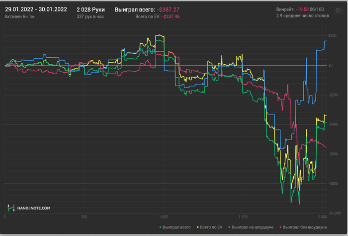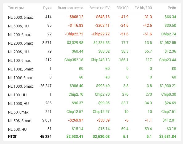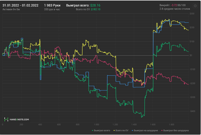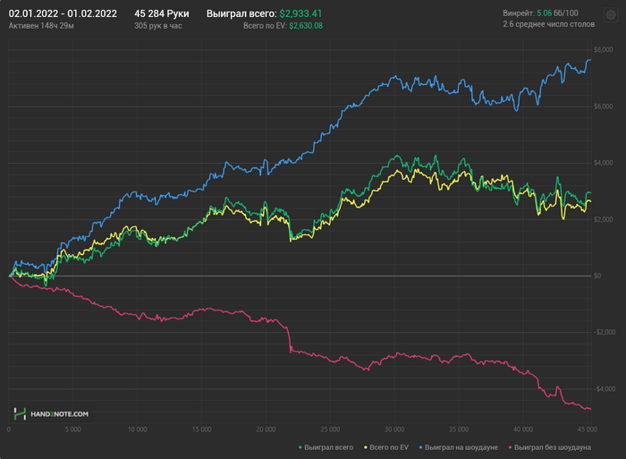 Можно сказать стиль игры полностью заруинился, последние пару недель играл с вентом до шд 35%, много стеков залил в тильте, постоянно сидя вообще без понятия как играть, ведь "в этом споте последние 10 раз никто не сфолдил, а надо ли вообще ставить?", постоянно усиливающиеся сомнения в компетенции и стратегии и все такое. Не знаю, влияние ли это рана последних дней января, но даже если тильт и (иногда) даунский селект исключить, несмотря на вроде бы нормальный результат, у меня стойкое ощущение, что нл200 не бью. Даже насчет нл100 не уверен, думаю должно быть 5-6бб, но, если честно, это не то, на что я рассчитывал. А нл200 от силы в пару бб покажу, скорее всего, а "бить" в моем понимании - это 8-9бб+ на сотке и 5-7+ на 200.