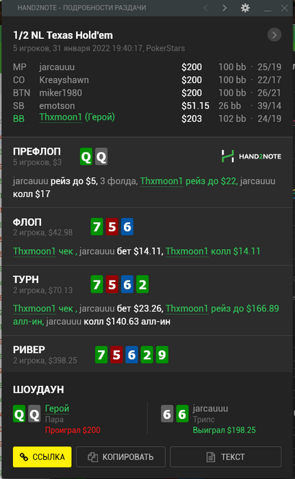 Подгорело люто с этой раздачи, которую я так бездарно сыграл. Уже ПОСЛЕ нее (да, гениально) посмотрел стсты и оппом оказался 42 ввсф бомж со 100 руками в год и фолдом на 3бет 45, так что там все сеты и на ривере нет блефов, x/c-x/c-x/f легчайший (а мб и всегда играть такой линией нужно и вс обычных оппонентов, не знаю. Моя линия выглядит совсем идиотской, ожидал получить коллы от 88-ВВ, но чет сомнительно. Даже если все это колит, там у такого фолда маленького все сеты и куча доперов и стритов) В общем надо начать смотреть иногда статы оппонентов.