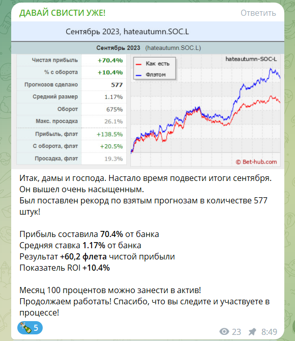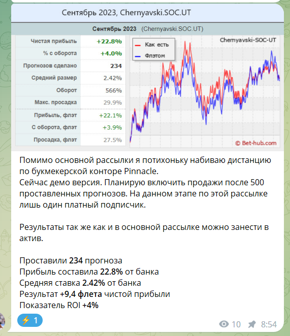 Ставить стал еще с первого курса университета. По поводу ставок, что интересно, я очень немного своих денег поставил в жизни. Как-то сразу решил, что можно монетизировать именно аналитическую составляющую. Наткнулся на биржу прогнозов (betonsuccess). Сейчас она уже Bet-hub называется. Там начал тестировать разные страты, пробовать, анализировать. Там можно помимо торговли просто вести статистику своей деятельности. Через пробы и ошибки пришел к тому, что можно наживать на длительной дистанции. Какого-то секрета успеха нет. С 2020 года, когда я начал впервые продавать подписку на прогнозы, у меня был лишь один минусовой месяц.