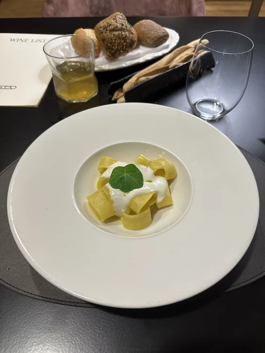 На стартер паста Calamarata с сыром Roccaverano. Оба названия услышал впервые. Очень вкусно. Прекрасно приготовленная паста с нежнейшим сыром, достаточно молочный вкус.
