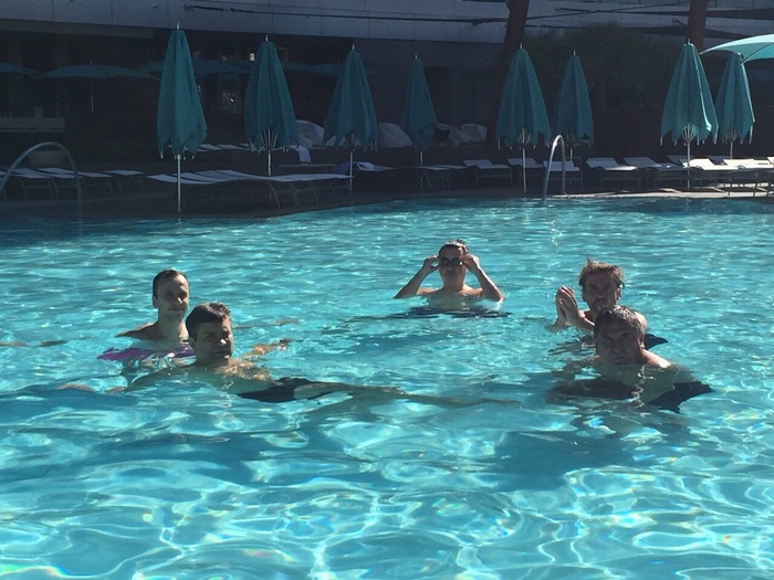Очень классно после завтрака на улице пока еще не сильно жарко окунуться в прохладный бассейн. Сегодня мне это было особенно кстати, так как вчера немного переборщил с количеством вина, выпитым с Артемом. Через час стартую первый турнир.