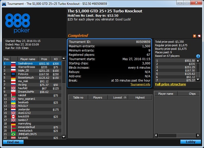 Еще играл спины за 25 на билеты в мейн эвенты. Сыграл совсем немного, меньше 100 или около того. И трижды мне выпадал билет на мейн за 1000$ Первые два раза я сливал вообще без шансов и это было уже давно. А вот третий раз играл за пару часов до старта мейна и выпал билет на 1000$, вот такая ключевая раздача: