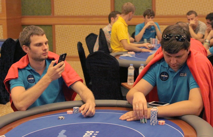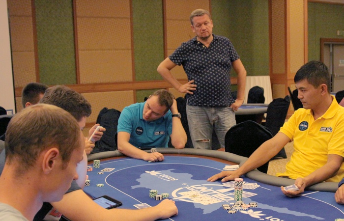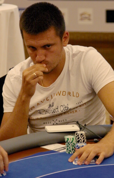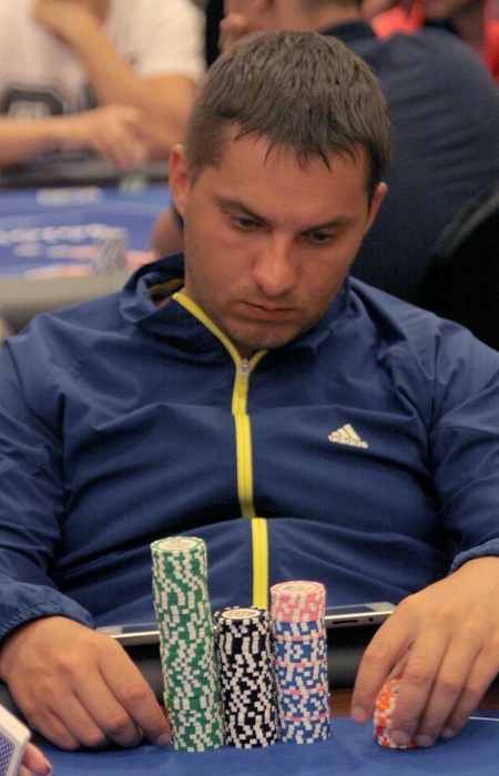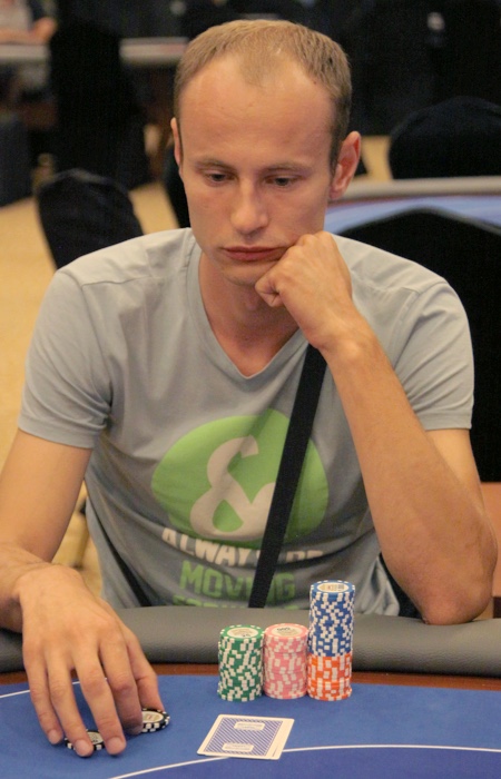 Stirlitz @ 13.8.2015 Еще один из чиплидеров - Владимир Микитюк. У него в стеке сейчас чуть больше 80К. Он без видимого напряжения выжил за столом Фаля и Пригарного.