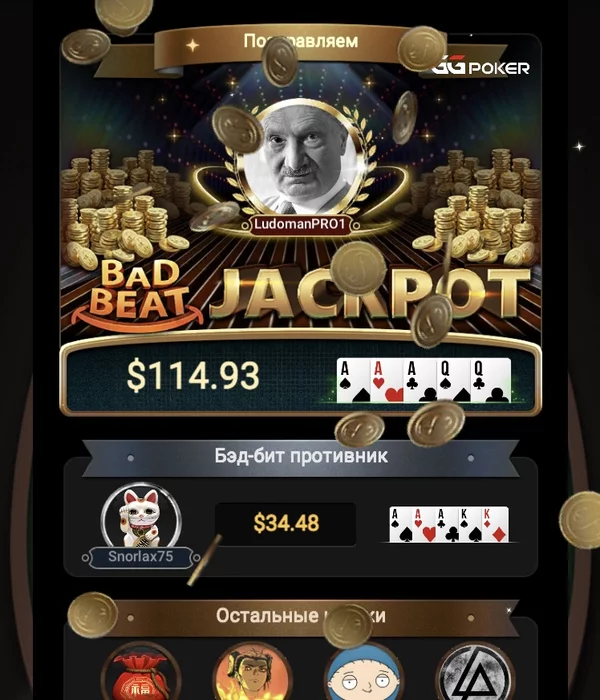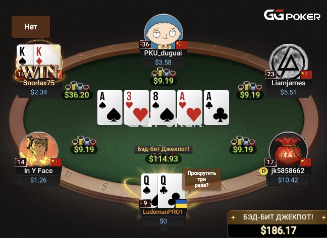 Ахаха) со мной произошла сейчас очень забавная история. Играю как обычно кэш, приходят две дамы, оппоненту короли, я предлагаю ему 3 раза раздачу крутить, он отказывает и я в чате ему пишу «хаха, ну не хочет человек бэд бит джекпота» и буквально пока я пишу в чате тут всплывает вот это: