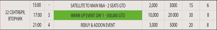 В 15:00 - сателлит на главный турнир SPT. Вступительный взнос - 2,000 рублей. Стартовый стек - 5,000 фишек. Уровни по 15 минут. Поздняя регистрация и ребай - в течение первых шести уровней. При наличии 26 входах - гарантировано два билета в мэйн, в противном случае один билет за 30,000 рублей.