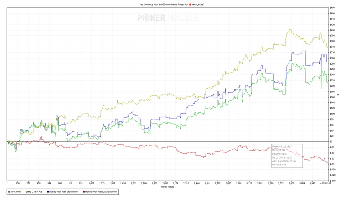 SB: 36.75 BB (VPIP: 10.53, PFR: 5.26, 3Bet Preflop: 0.00, Hands: 20)
