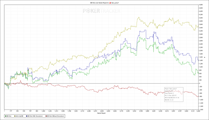 PokerStars - SC1000+0|40/80 Ante 5 NL - Holdem - 9 playersHand converted by PokerTracker 4MP+2: 42.25 BB (VPIP: 25.00, PFR: 0.00, 3Bet Preflop: 0.00, Hands: 20)