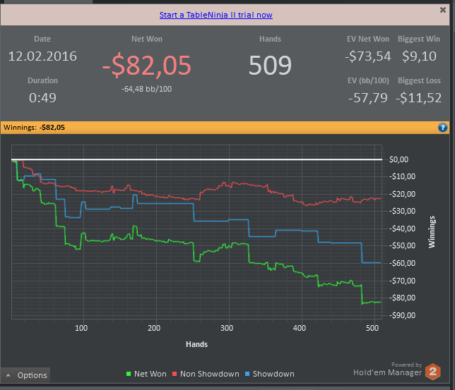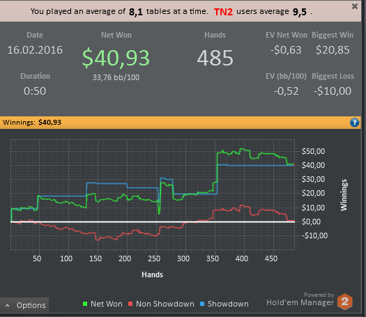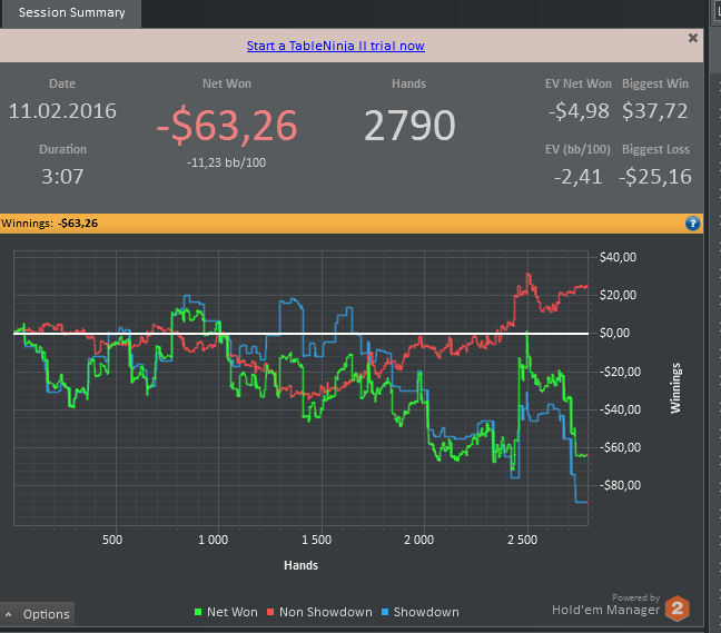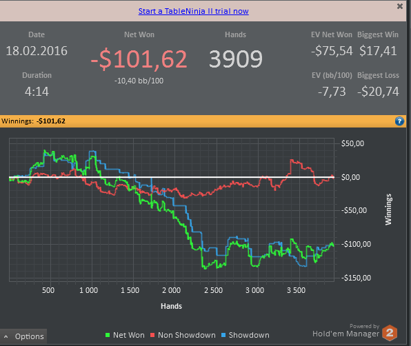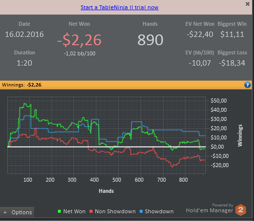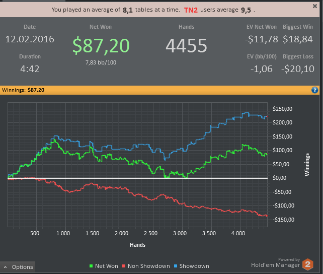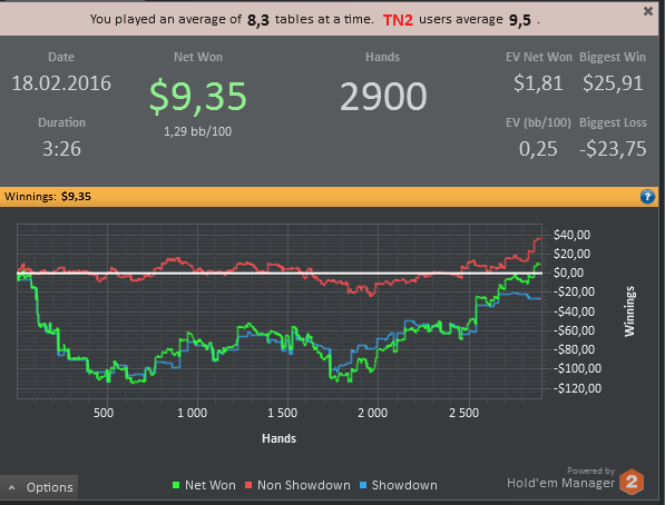 отыграл сессию в не самой лучшей форме , играл на автомате , концентрация за столами была просто ужасной , хотя я и не делал крупные ошибки , игрой своей совсем не доволен . Эту неделю точно буду играть в лайтовом режиме , буду больше уделять время теории и разбору раздач