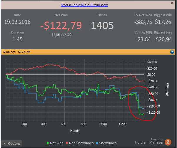 в первые за этот год я попал в нормальный тильт , наверное за раздач 20 всадил 60$ , не так уж и много , но я их реально просто подарил ( , цель блога была в том что бы расти по лимитам , играть меньше , более вдумчиво ,и не как не радовать деньги , а на деле получается , как только мой БК подрастает , я сразу на лимите выше всё спускаю , потом отхожу недельку , начинаю вроди нормально играть , потом в голову взбредёт опять какая-нибудь гонка , или хочу статус повыше , и начинается опять бездумная игра , и из за всего этого я играю в 0 , а если ещё и пробую себя на лимите выше , то часто и в минус