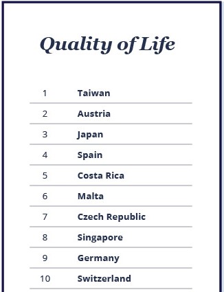 В результате опроса по программе Expat Insider Испания заняла 4 место по лучшему уровню жизни среду экспантов. результате данной программы участникам задавали вопросы о здоровье, безопасности, качестве жизни, отдыхе, инфраструктуре, доступности, финансовом благосостояние и так далее. Подробнее: