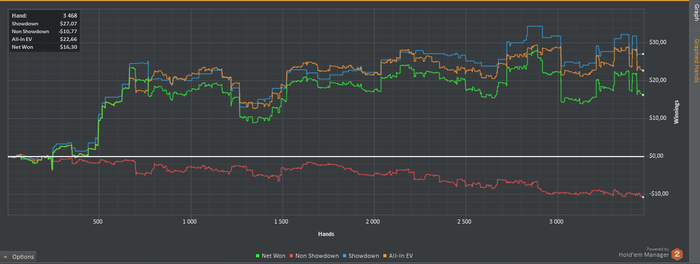 Start Bankroll 652,62$; Stop Banrkoll 668,92$; Cтолов 6; Мини сессий 6; Рук: 3468; Время = 360 мин; Результат = 16,3$; bb/100 = 9,40; Моя оценка = 0 з 10. Цель на день Net Won(70$) выполнена на 23,2%; Цель на день Hands (3000) выполнена на 115,5% Цель Руки на первый игровой отрезок за все дни (100К) выполнена на 88,7% (88758 рук); Цель Win Rate на первый игровой отрезок за все дни (542,74$) выполнена на 39% (212,07$); Comment: Последную сессию провалил, Завтра как наказание делаю день ОФ.