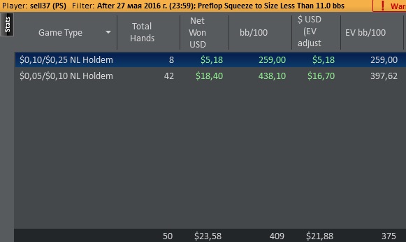но тут нужно еще больше фильтров выставлять. Возможно где ты был банк на троих, где-то на четверых. Как поставить фильтр, что все фолдят на твой сквиз я не нашел. Интересно посмотреть насколько чаще фолдят на разный размер сквиза.