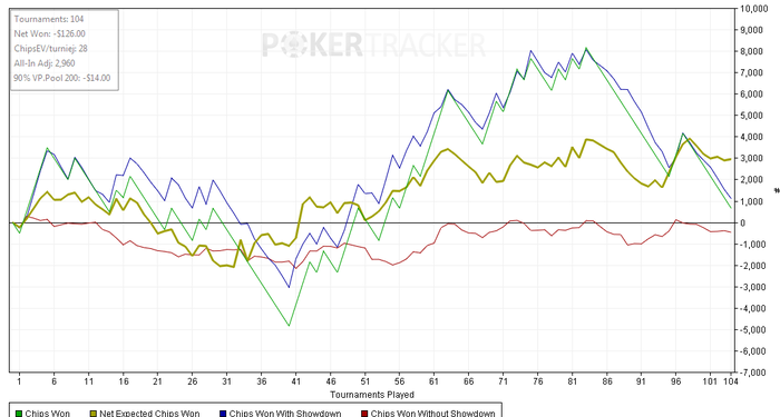 Tawer95, больше играй, меньше смотри граф. у меня бывают периоды в ноль фишек по ев на 100-200 турниров. недавно 200 турниров в - по ев сыграл ) по моему - 65 фишек с турнира