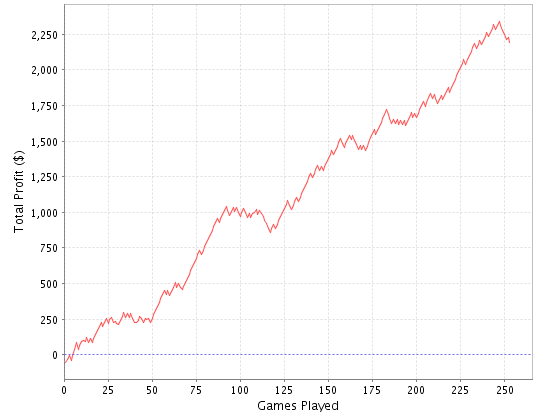 Оказался плюсовым, но на мизерной дистанции в 26 турниров, около 125 у.е. профита.