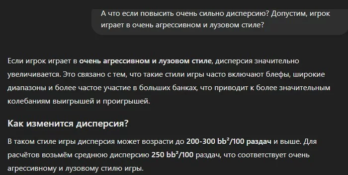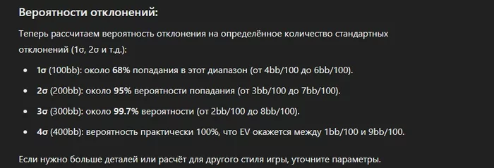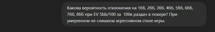 Какова вероятность отклонения на 1бб, 2бб, 3бб, 4бб, 5бб и т.д. при EV 5bb/100 за 100к раздач. Нужно, короче, с этими ребятами, как с чатом GPT общаться...ооо...а это идея. Chat gpt.
